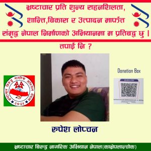 काठमाडौं । भ्रष्टाचार प्रति शुन्य सहनसिलताको नीतिमा प्रतिबद्ध रहि शान्ति ,बिकास र उत्पादन मार्फत संमृद्ध नेपालको परिकल्पना गर्दै सामाजिक संगठनको रुपमा अगाडी बढिरहेको भ्रष्टाचार बिरुद्ध नागरिक अभियान नेपाल प्रति युवाहरुको चासो बढेको छ ।