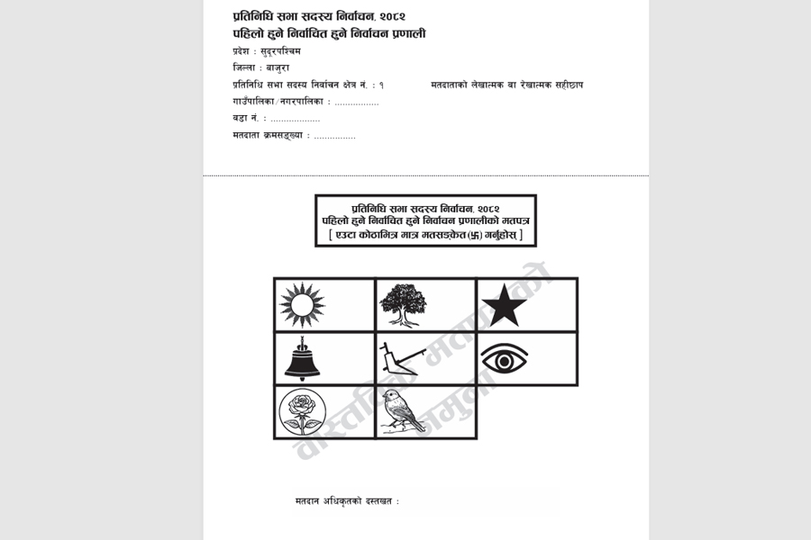 काठमाडौं :निर्वाचन आयोगले प्रतिनिधिसभा सदस्य निर्वाचनका लागि विभिन्न जिल्ला र निर्वाचन क्षेत्रको मतपत्रको नमूना सार्वजनिक गरेको छ ।