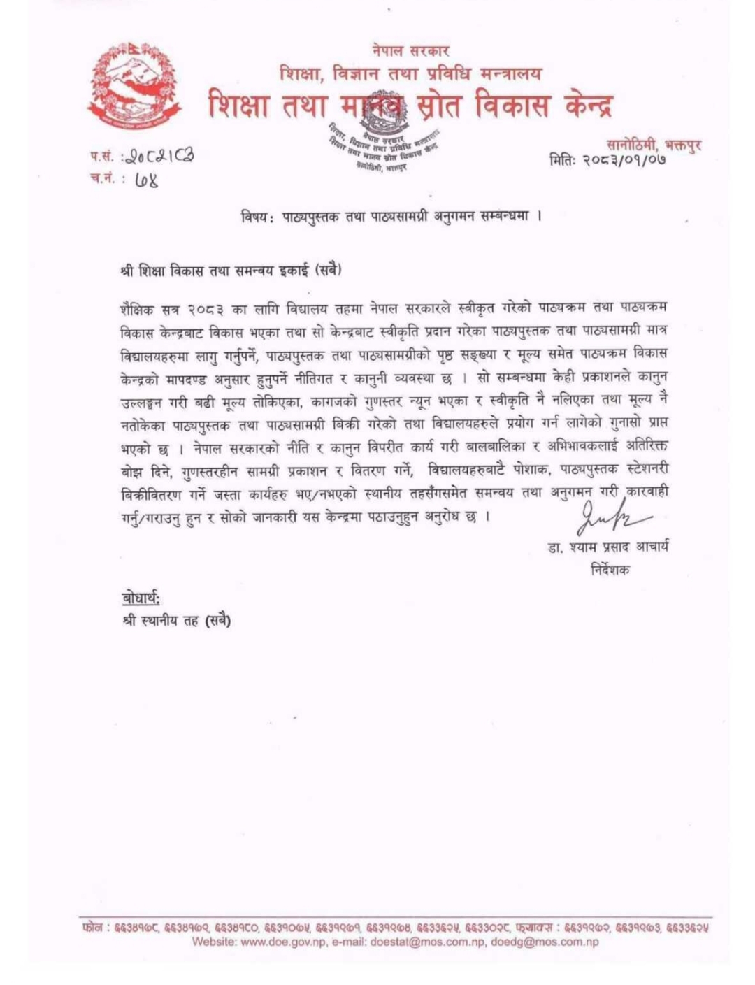 काठमाडौं :शिक्षा तथा मानव स्रोत विकास केन्द्रले शैक्षिक सत्र २०८३ का लागि विद्यालयहरूमा सरकारद्वारा स्वीकृत पाठ्यपुस्तक मात्र प्रयोग गर्न र विद्यालय परिसरभित्रै पोसाक तथा स्टेशनरी बिक्री नगर्न निर्देशन दिएको छ । देशभरका ७७ वटै शिक्षा विकास तथा समन्वय एकाइहरूलाई पत्राचार गर्दै यस विषयमा तत्काल अनुगमन गरी कारबाही अघि बढाउन केन्द्रले निर्देशन दिएको हो ।
